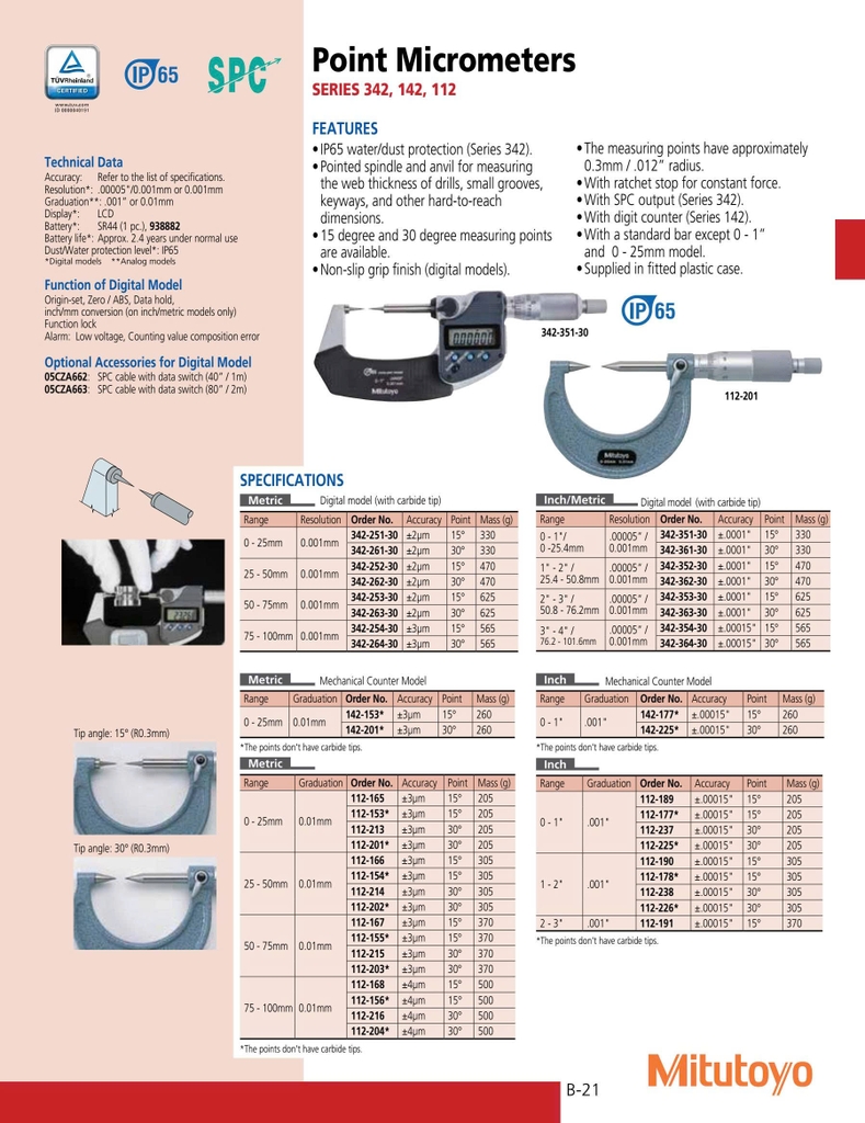 | 0 – 1” / 0 – 25.4mm | 0.0005” / 0.001mm | 342-361-30 | ±0.0001” | 30° |