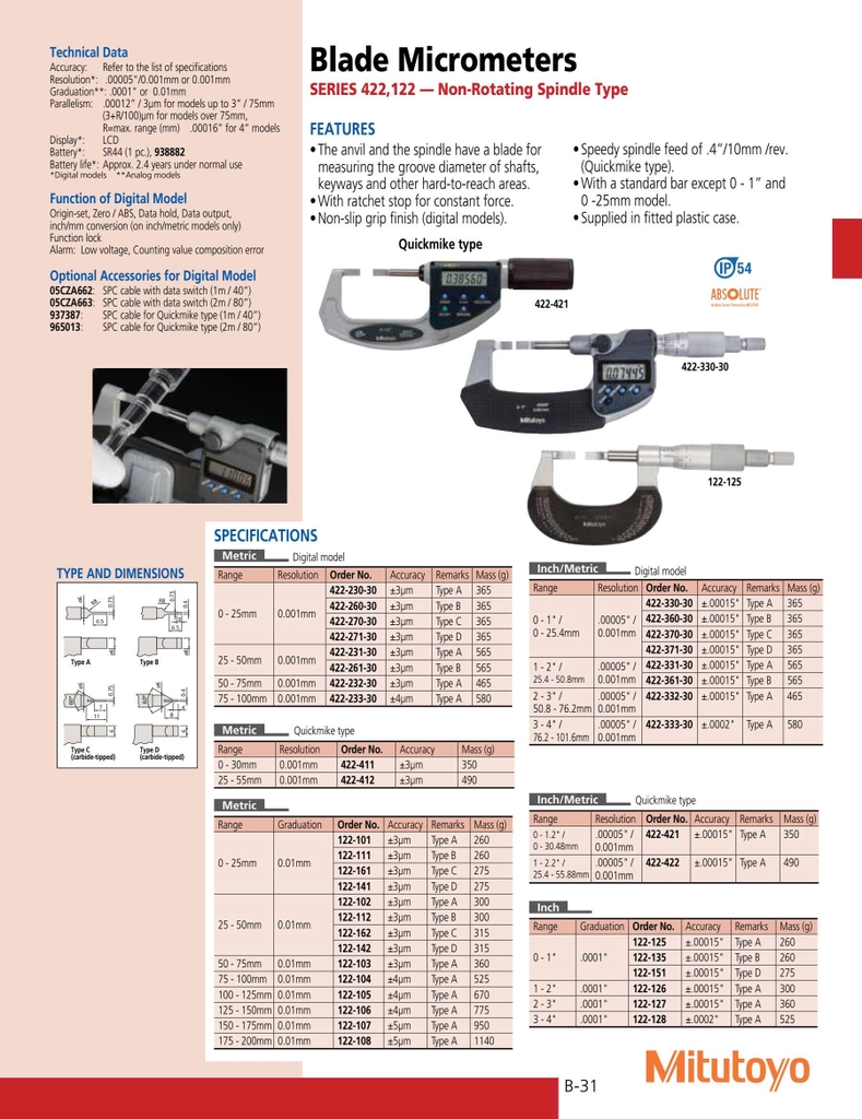 | 0 – 1” | 0.0005” / 0.001mm | 422-330-30 | A | ±0.00015” |