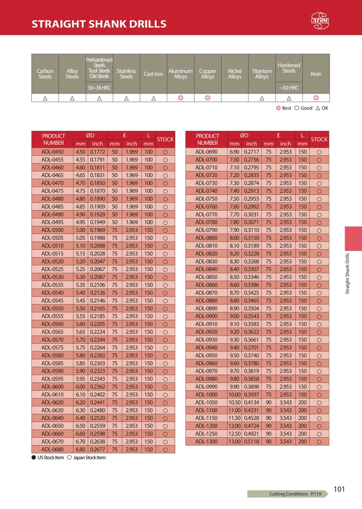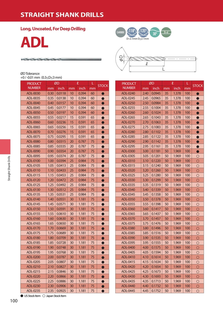 ADL – ATOM Nhật Bản là dòng mũi khoan hợp kim nguyên khối (solid carbide) thiết kế long type (rãnh dài tiêu chuẩn) với góc đỉnh 118°, không phủ, chuyên dùng cho gia công nhôm, đồng và vật liệu kim loại màu.