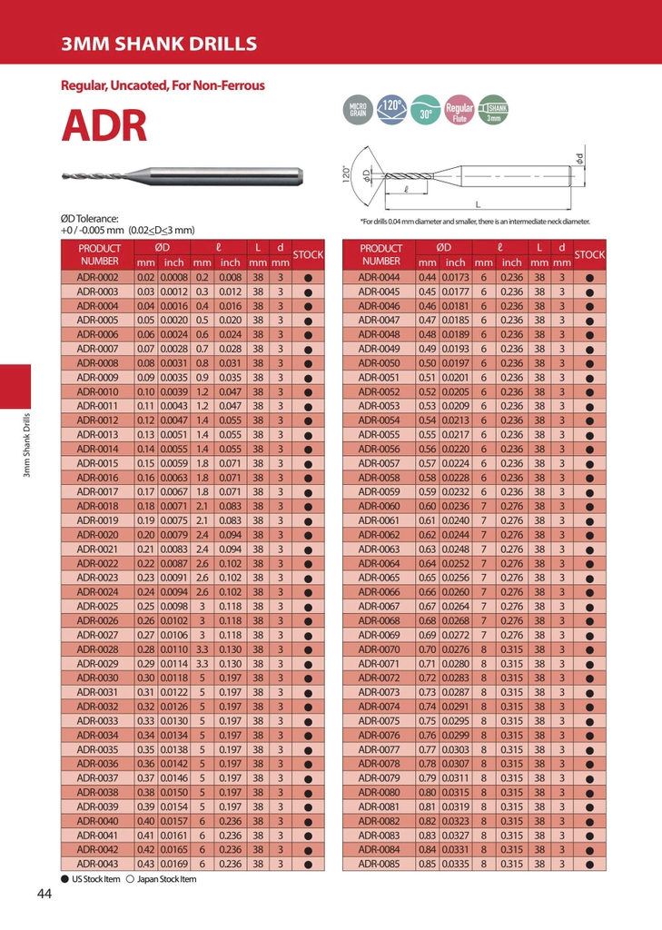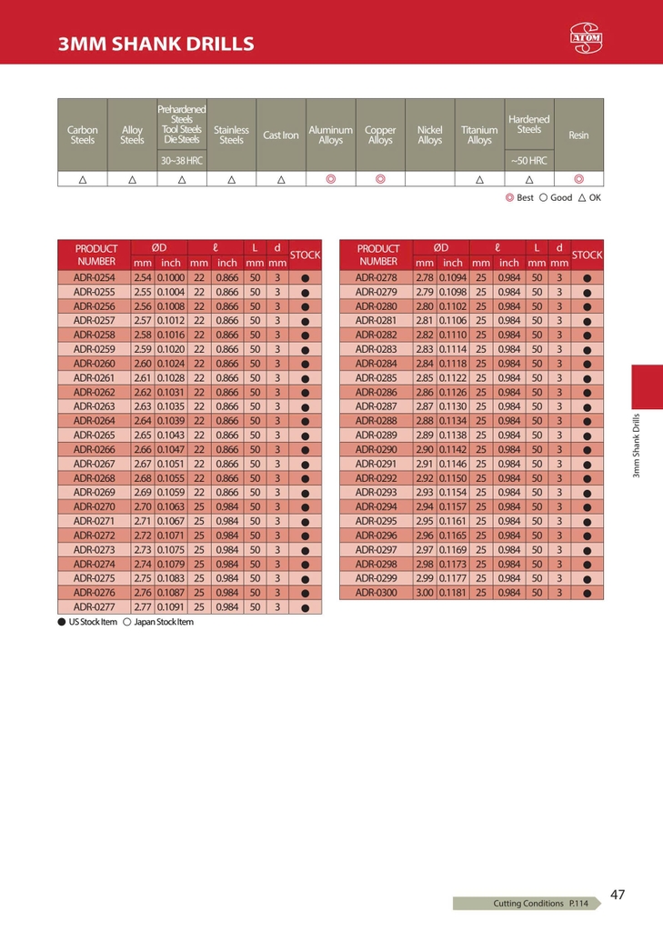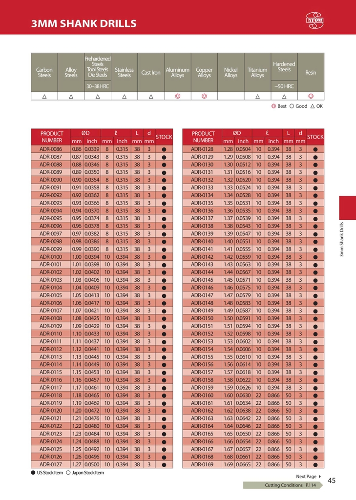 ADR Series – ATOM Nhật Bản là dòng mũi khoan hợp kim (solid carbide) thiết kế flute tiêu chuẩn (standard flute), dùng cho gia công khoan phổ thông đến chính xác cao.