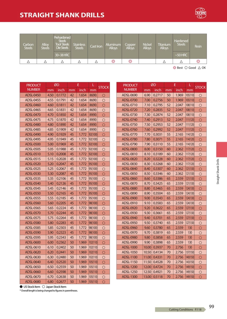 ADSL – ATOM Nhật Bản là dòng mũi khoan hợp kim nguyên khối (solid carbide) thiết kế long type (rãnh dài hơn tiêu chuẩn), góc đỉnh 118°, không phủ, chuyên dùng cho gia công nhôm, đồng và vật liệu kim loại màu.