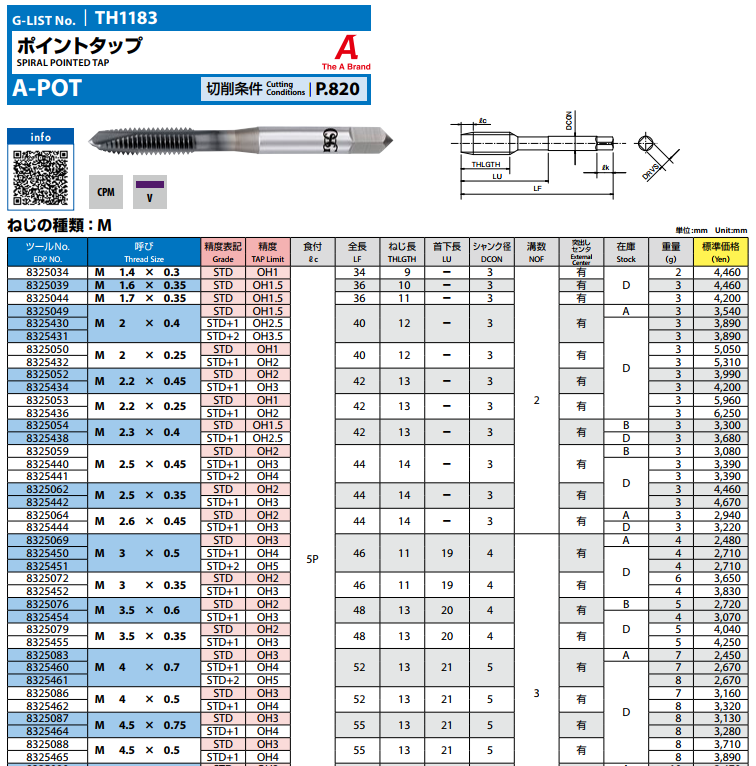 Mũi taro A-POT của hãng OSG là dòng mũi taro thẳng thuộc phân khúc hiệu suất cao A-Tap của hãng OSG (Nhật Bản), được thiết kế chuyên dụng để gia công lỗ thông (thủng). Đây là dòng taro đa năng (Multi-purpose) ứng dụng được trên nhiều loại vật liệu khác nhau.