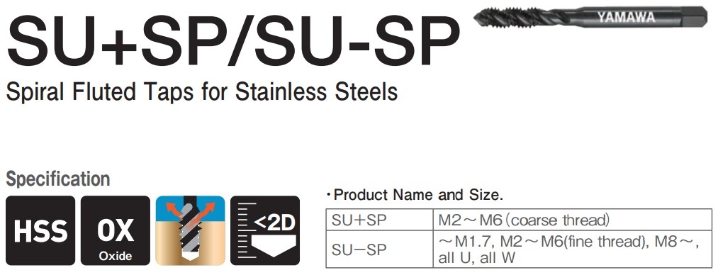 SU+SP / SU-SP Yamawa là dòng taro xoắn (Spiral Flute Tap) chuyên dụng cho gia công inox (thép không gỉ), được thiết kế để xử lý vật liệu khó như SUS304, SUS316 với khả năng thoát phoi tốt và chống dính phoi.