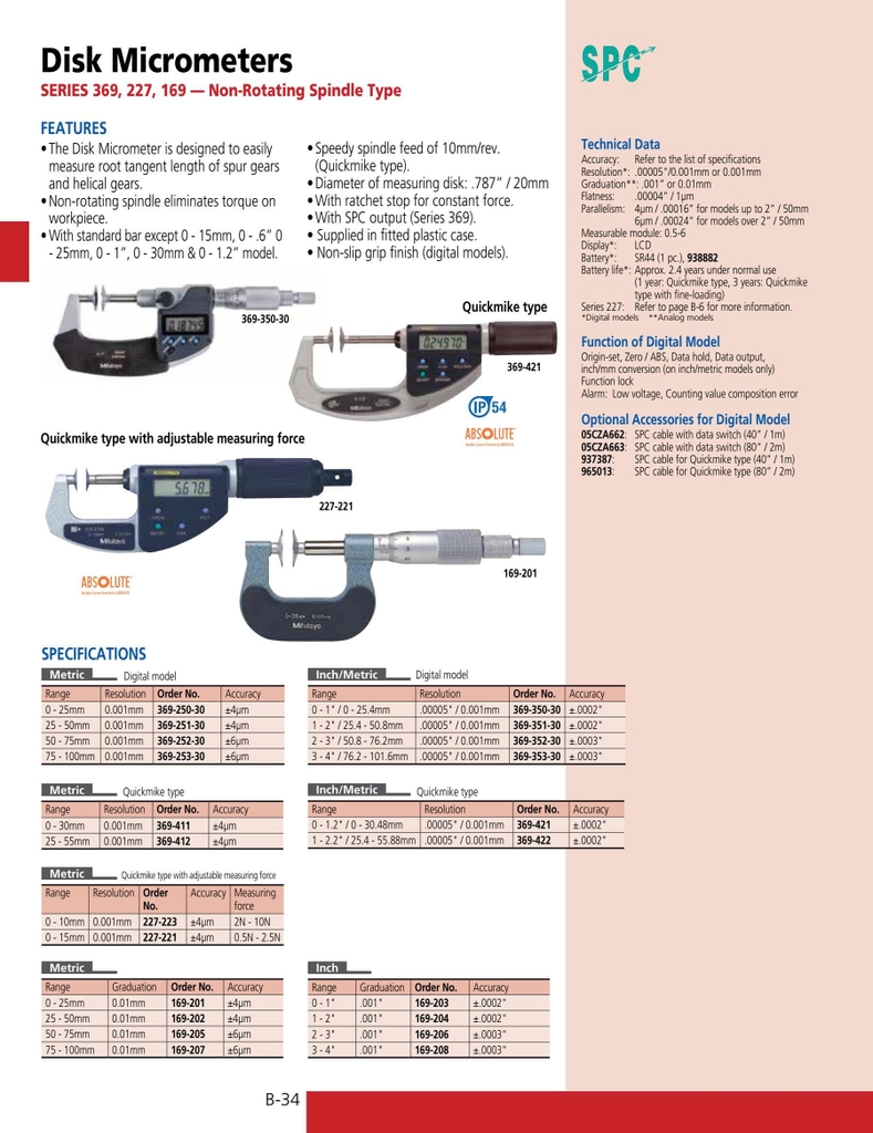 | 0 – 1” | 0.00005” / 0.001mm | 369-350-30 | ±0.0002” |