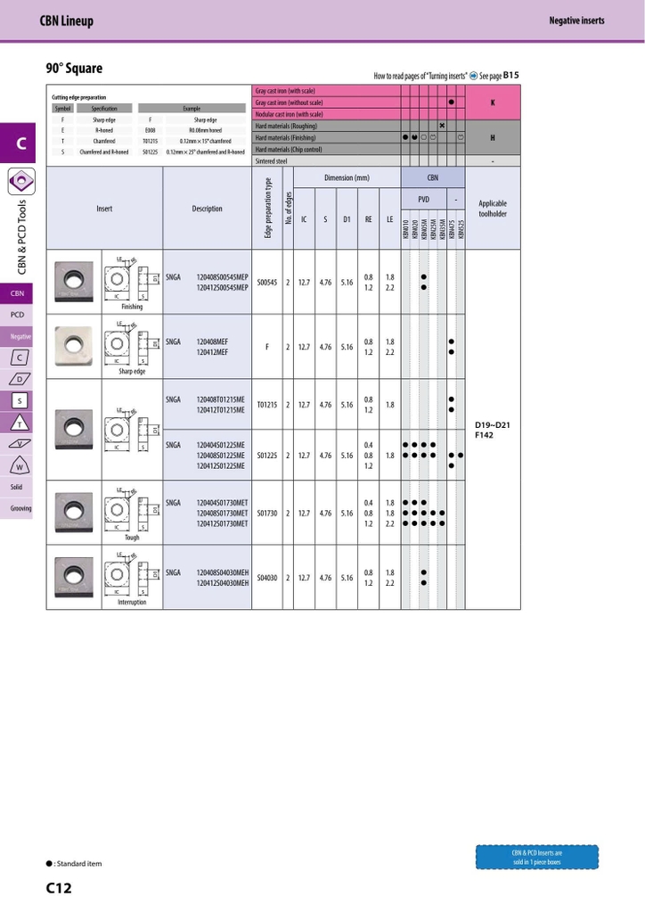Mảnh dao tiện CBN Kyocera SNGA1204 là dòng insert siêu cứng chuyên dùng cho gia công thép tôi (HRC 45–65+), nổi bật với thiết kế vuông 90° (S-type) giúp tăng độ cứng vững và khả năng chịu tải.